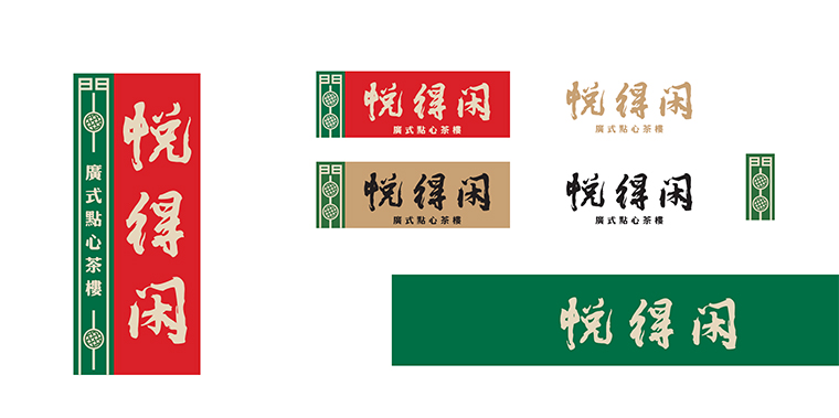 因此,悅得閑的logo我們使用圖形加文字的形式。大紅色的底色上用金色的品牌字,傳遞一種茶樓出品的品質(zhì)感,表示金字招牌之意。左側(cè)綠色色塊上一個原創(chuàng)圖形,取自于得閑飲茶的閑字,將閑字變形,用點(diǎn)心蒸籠的圖形填充,表明了品類屬性也傳達(dá)了得閑飲茶的文化IP。