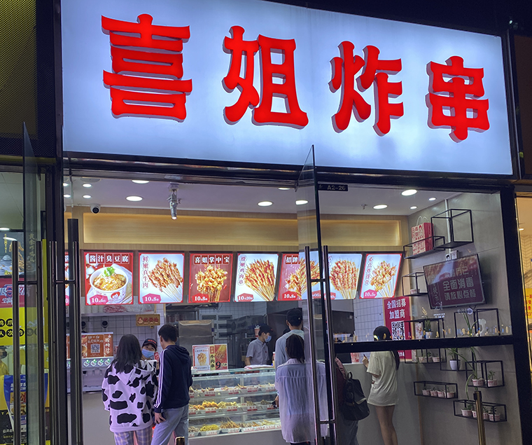 看喜姐炸串的門店裝飾裝修設(shè)計(jì),我們來分析下喜姐炸串品牌名和門頭設(shè)計(jì)有哪些亮點(diǎn),可供各位餐飲人借鑒參考。