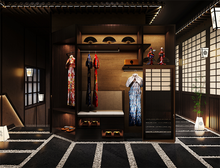 二樓除了必備的洗手間、儲(chǔ)物柜外,還設(shè)置了和服展示區(qū),這是餐飲娛樂化的一大重要趨勢(shì)。很多女性消費(fèi)者在日本料理店消費(fèi)時(shí)喜歡穿著和服自拍分享,彰顯個(gè)性也很有趣味,可以很好地把我們玉椿品牌傳播出去。品深餐飲設(shè)計(jì)就順應(yīng)這種潮流趨勢(shì),擁抱變化,主動(dòng)設(shè)置拍照打卡區(qū),讓消費(fèi)者傳頌。