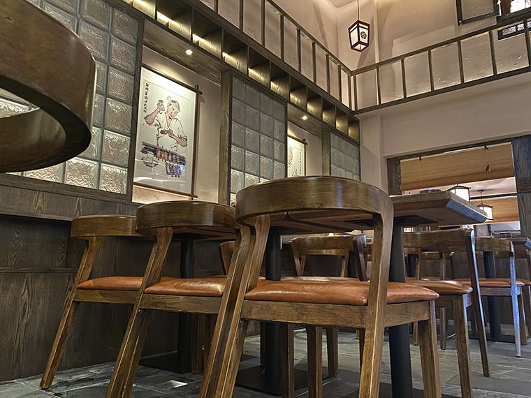 為了營(yíng)造京都風(fēng)格的空間感受,品深餐飲為玉椿設(shè)計(jì)定制的家具采用了實(shí)木材質(zhì),開放漆做舊工藝處理,呈現(xiàn)出一種江戶時(shí)代的歷史滄桑質(zhì)感;與門店的招牌匾額,儲(chǔ)存柜顏色完全一致,顧客使用時(shí)候的歷史體驗(yàn)感更為強(qiáng)烈。