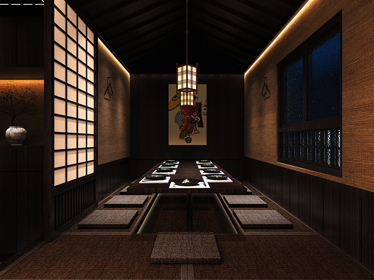 我們從門頭開始到天花吊頂、地面鋪設(shè)、墻面涂料、燈光、家具等各方面圍繞“京都味道、匠傳玉椿”來展開步移景異,一步一景的空間效果圖設(shè)計(jì)。