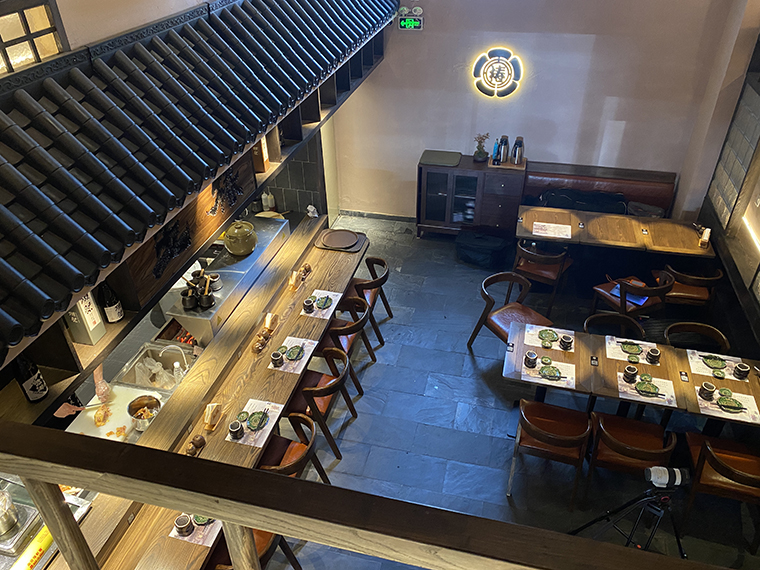 2、一樓大廳及吊頂?shù)脑O(shè)計(jì):把京都的古老街道,巷子搬到我們店里。整個(gè)大廳的頂部環(huán)繞一圈日式黑瓦頂,四周幾個(gè)日式玻璃木窗,與地面的青石瓦面,墻體的稻草漆,燒烤吧臺(tái)形成一體化的京都風(fēng)格。置身其中,仿佛漫步于京都的古老美食街道中,熙熙攘攘,熱鬧非凡,抬頭間還能看見二樓的日本侍女正在推開窗戶,朝著樓下觀望。