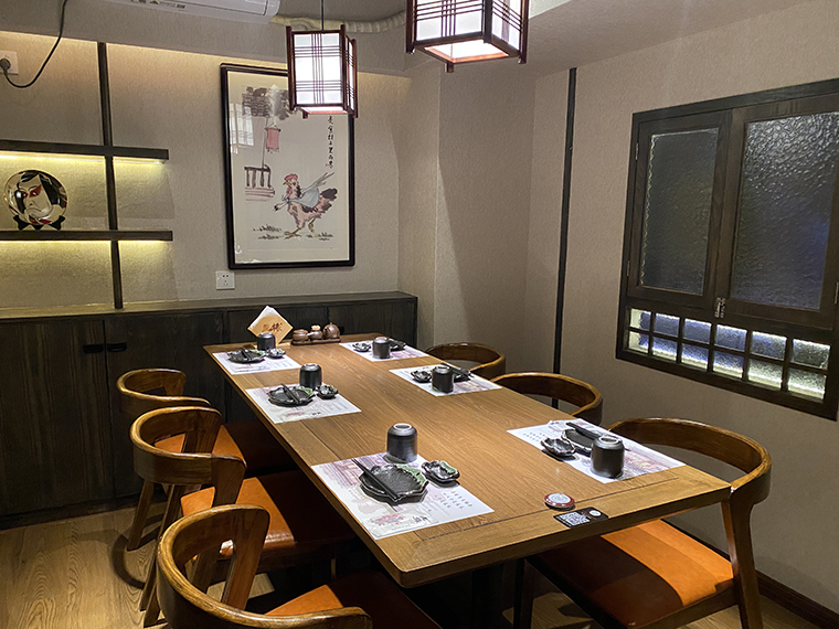 最能體現(xiàn)居酒屋熱鬧感的是大廳,最能感受燒鳥店煙火氣的是燒烤臺(tái)前的長(zhǎng)吧臺(tái)。當(dāng)我們坐在燒鳥長(zhǎng)吧臺(tái)前,看著燒鳥師傅熟練地穿串,精準(zhǔn)地控制火候,不時(shí)地翻動(dòng)烤串,美味現(xiàn)場(chǎng)呈現(xiàn),匠傳玉椿的理念就鮮明直觀地傳達(dá)出來了。所以,整個(gè)大廳都是圍繞著燒烤吧臺(tái)這一焦點(diǎn)而展開的,全部為單人椅及兩人座位,位置靈活組合,利用率非常高。