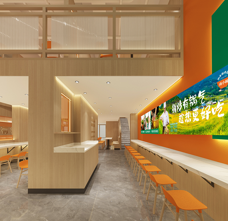 3、內(nèi)部使用大面積的橙色體現(xiàn)鮮炒有鍋氣的特點,橙色既使人產(chǎn)生一種陽光熱情的心里感受,又是現(xiàn)炒時火焰的顏色,體現(xiàn)了現(xiàn)炒的特性,識別度非常高。整面墻的木色板材,木色有自己獨特的質(zhì)感、在空間中又更有親和力,在狹窄的簡餐空間中也會讓人感受到輕松,給人一種可釋懷的愉悅,讓人隨時隨地都能感受到大自然的生機。