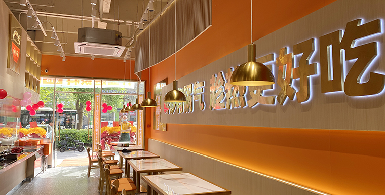 2、門口大面積落地玻璃、墻面使用板材,白色大理石臺面、灰色地面、木色桌面,橙色亞克力板。整個空間追求明亮、整潔、舒適的視覺感受。尤其是門口的落地玻璃,窗明幾凈,讓路過的消費者都能看見店內(nèi)熱火朝天的狀態(tài),鍋氣繚繞的煙火氣,產(chǎn)生強烈的進店沖動。