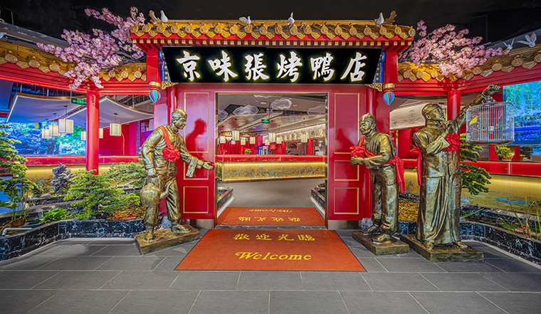 門口的迎賓人,提籠遛鳥人,跑堂人等雕塑銅人將老北京烤鴨飲食文化自然帶出;空間大量借鑒中式園林造景手法,點綴綠植,水景,框景,步移景異;