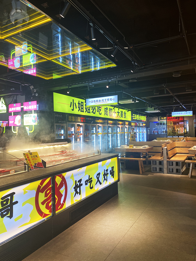 串串香火鍋的用餐特點比較獨特,類似自助火鍋。顧客自己到冰柜取串串,拿飲品,喜歡什么就拿什么。因此,在門店功能設計方面,取串串的冰柜是客流最密集的地方,需要給顧客展示出串串品類特別多的優勢。